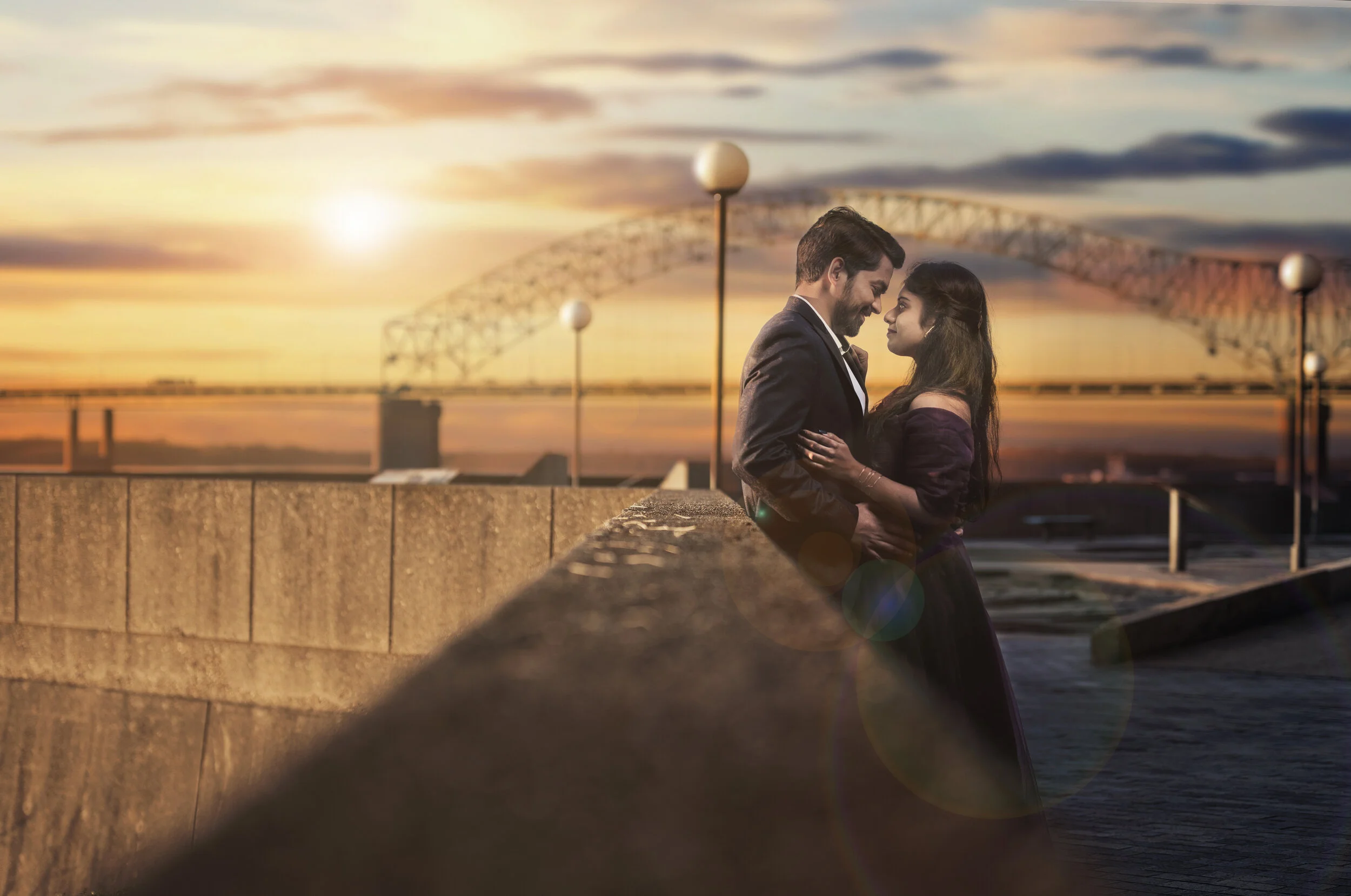 Let’s be really honest here: We think this is a stunning capture straight from the camera. The couple is placed perfectly on the rule of thirds (look it up if you don’t understand, it actually looks better), the sunlight is falling from the left on the subject, and to adjust the shadows on the other end, we light up our newer 32 inch soft box with a Goddox tt600 flash, providing just the right amount of light ratio required for a good composition. Also to add to it, the camera was placed on the surface to get a pattern of the wall running towards the subject to gain viewers’ attention and of course the iconic Mississippi River Bridge in the background. Love it!